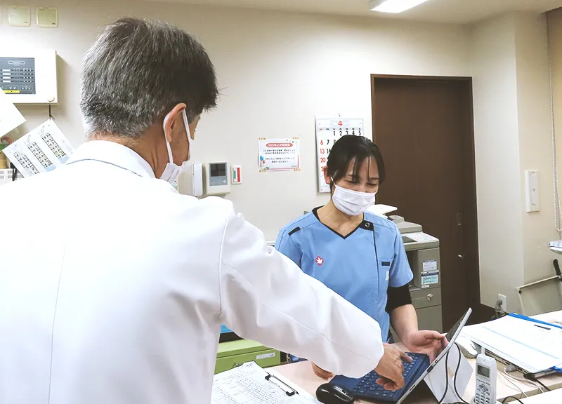 長期間ベッドで安静にすることによるADLの低下や、肺炎や尿路感染等、高齢者疾患の根底にある低栄養リスクに備え、当院では多職種で機能向上委員会を開催し、知識向上と医療の質の向上に努めています。摂食・嚥下チーム(SST)をはじめ、早期在宅復帰を目指します。また、施設へのST派遣も行い、退院後のADL機能の維持も支援。嚥下評価および介護職員への指導など、多彩な支援で、介護・医療連携のさらなる強化を図ります。